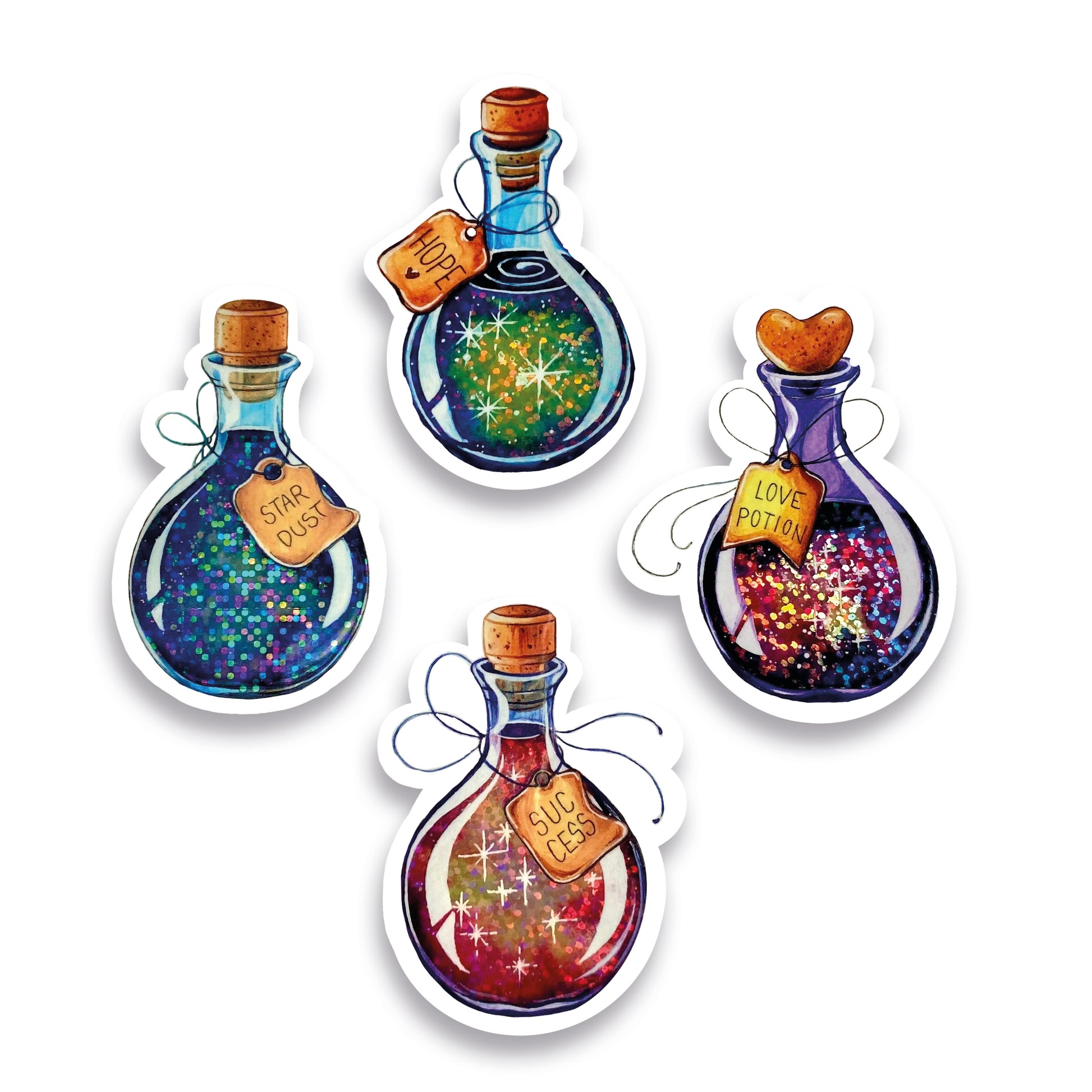 Alle Motive wurden im Original mit Aquarellfarben gemalt. Die Tränkchen haben folgende Themen: Liebestrank, Sternenstaub, Hoffnung und Erfolg.