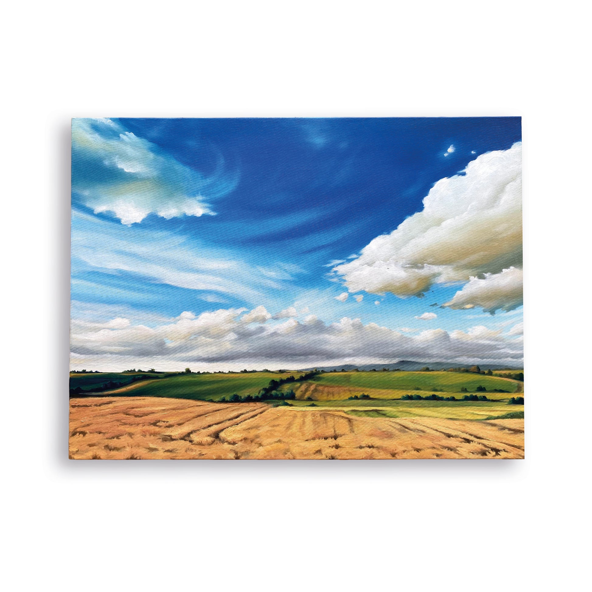 Dieses Landschaftsgemälde auf Keilrahmen im Format 60 x 80 cm fängt die Weite eines Kornfeldes unter einem blauen Himmel mit zarten Schleierwolken und imposanten Wolkentürmen ein. Die Ölmalerei verbindet lebendige Farben und feine Details, die die natürliche Atmosphäre und die ruhige Stimmung der Szene eindrucksvoll vermitteln. Ideal für Liebhaber realistischer Landschaftskunst, die ihrem Raum eine harmonische und zugleich dynamische Note verleihen möchten.