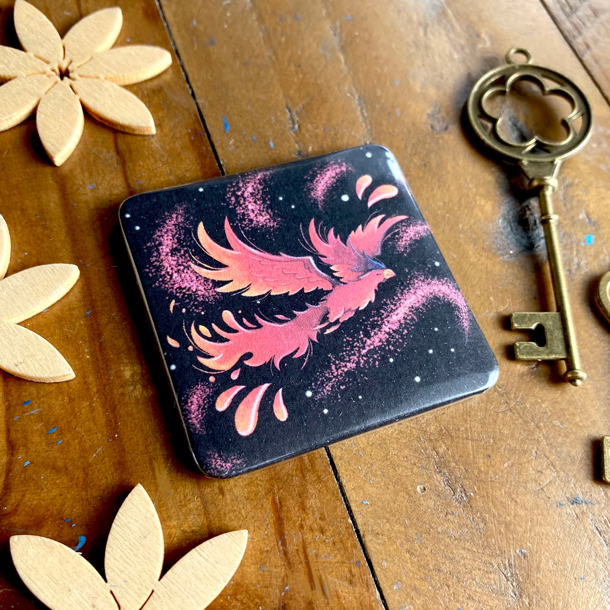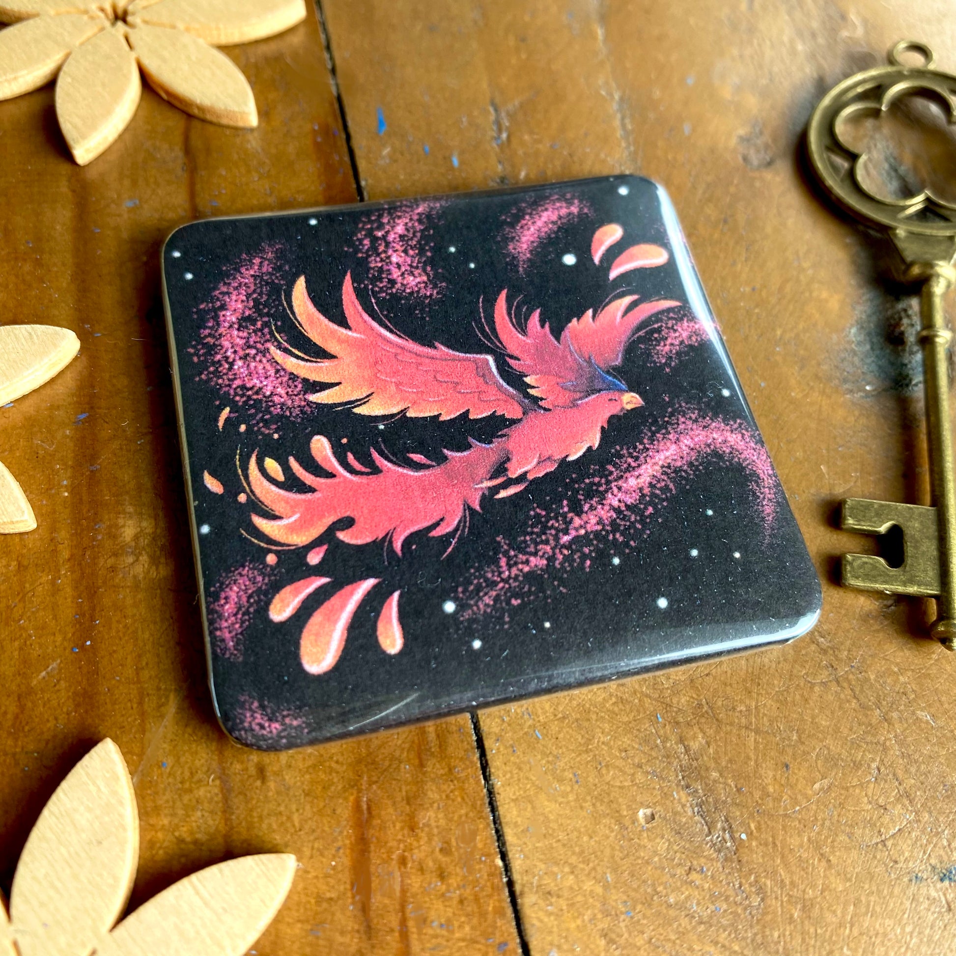 Dieser aufregende Magnet im quadratischen Format sorgt für gute Laune! Er zeigt einen stolzen Phönix, der mitsamt Feuerschweif durch die Lüfte flattert. Das Motiv eignet sich bestens zum Sammeln, Schmücken und Dekorieren.
