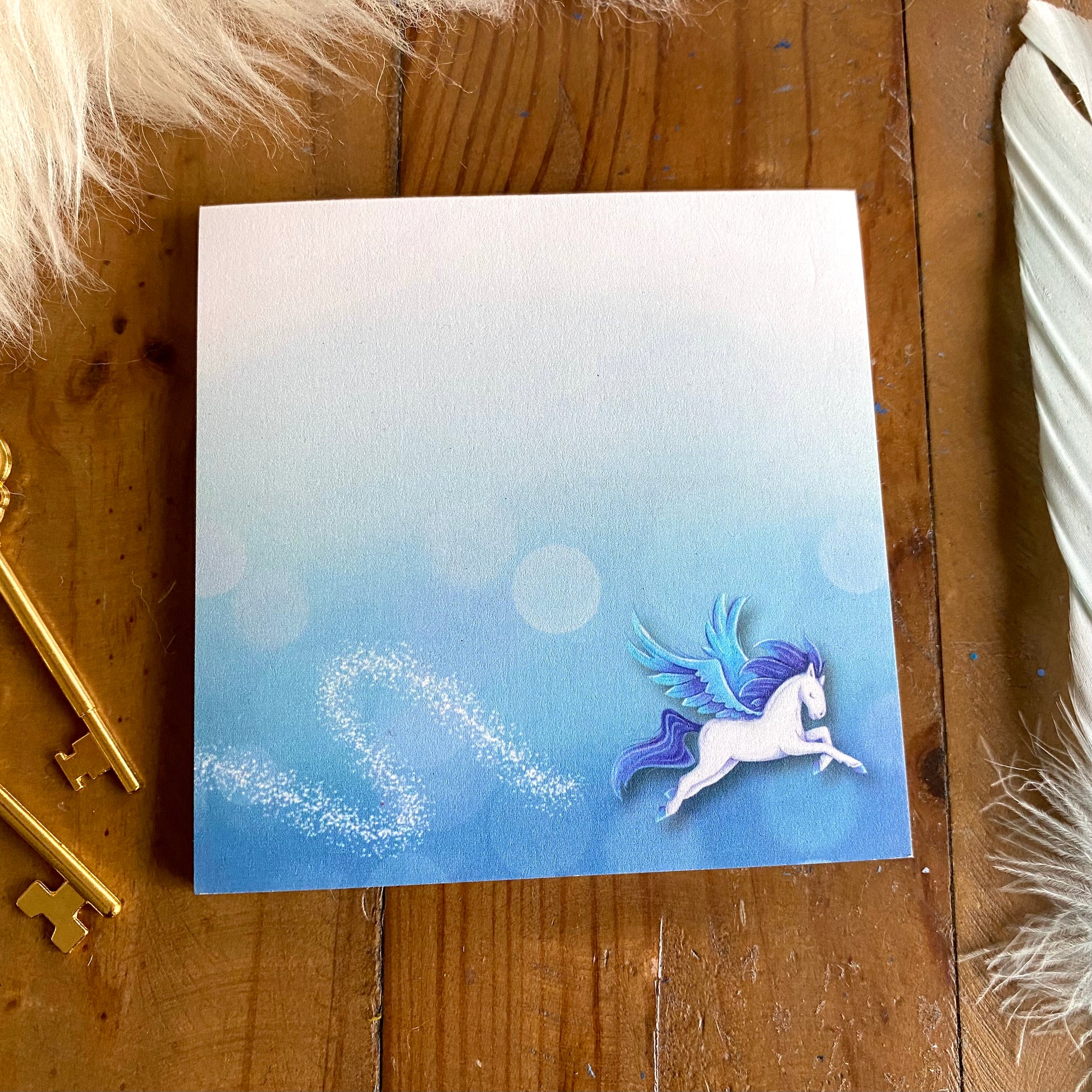 Das stolze geflügelte Pferd entstammt der griechischen Mythologie. Es steht symbolisch für Kraft, Freiheit und den Mut, die eigenen Träume zu verfolgen. Der Pegasus wurde im Original mit Aquarellfarben gemalt.