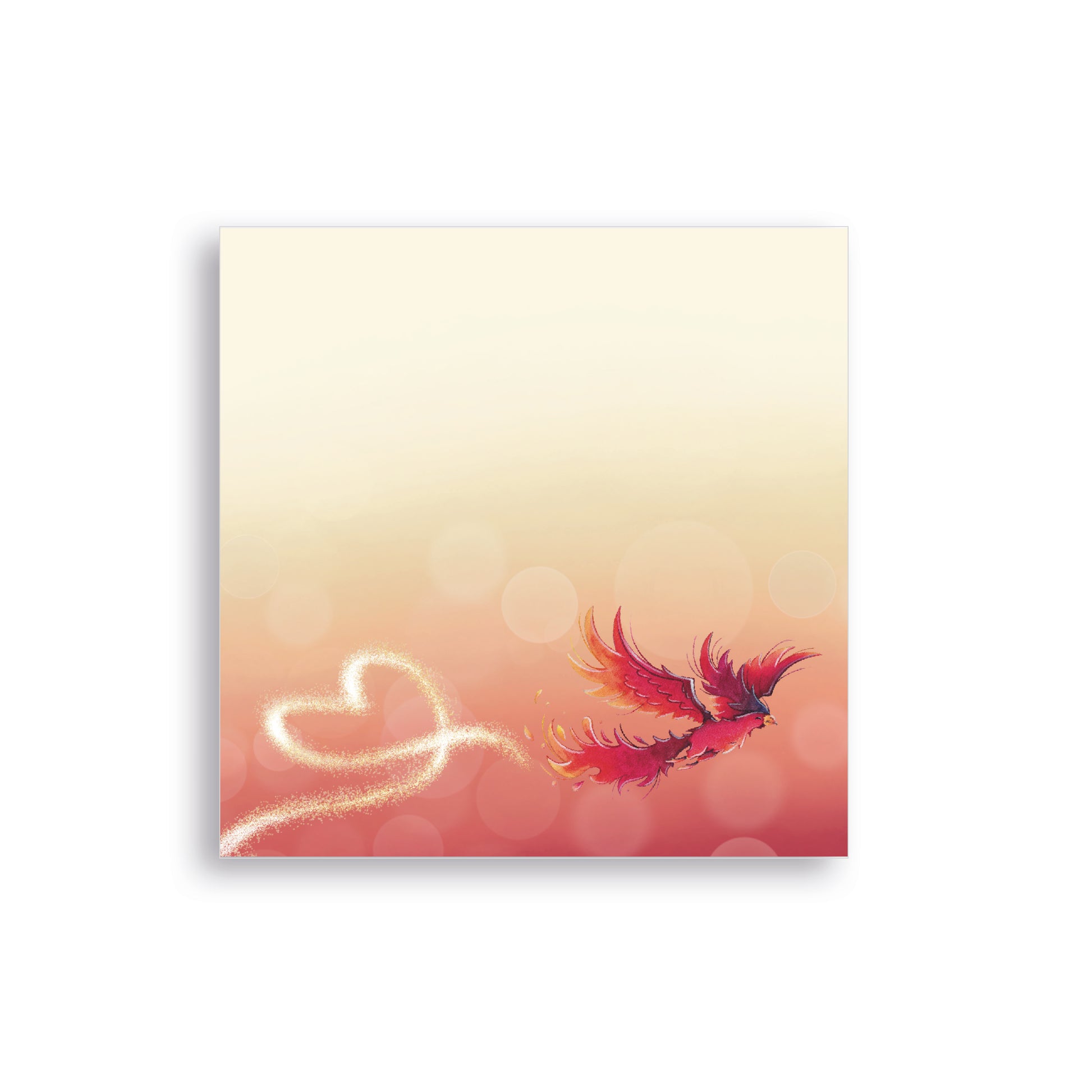 Der Phönix ist ein uraltes Wesen der Sagen- und Märchenwelt und steht symbolisch für die Unsterblichkeit, da er nach seinem Tod aus seiner eigenen Asche wieder aufersteht. Der Phönix wurde im Original mit Aquarellfarben gemalt.