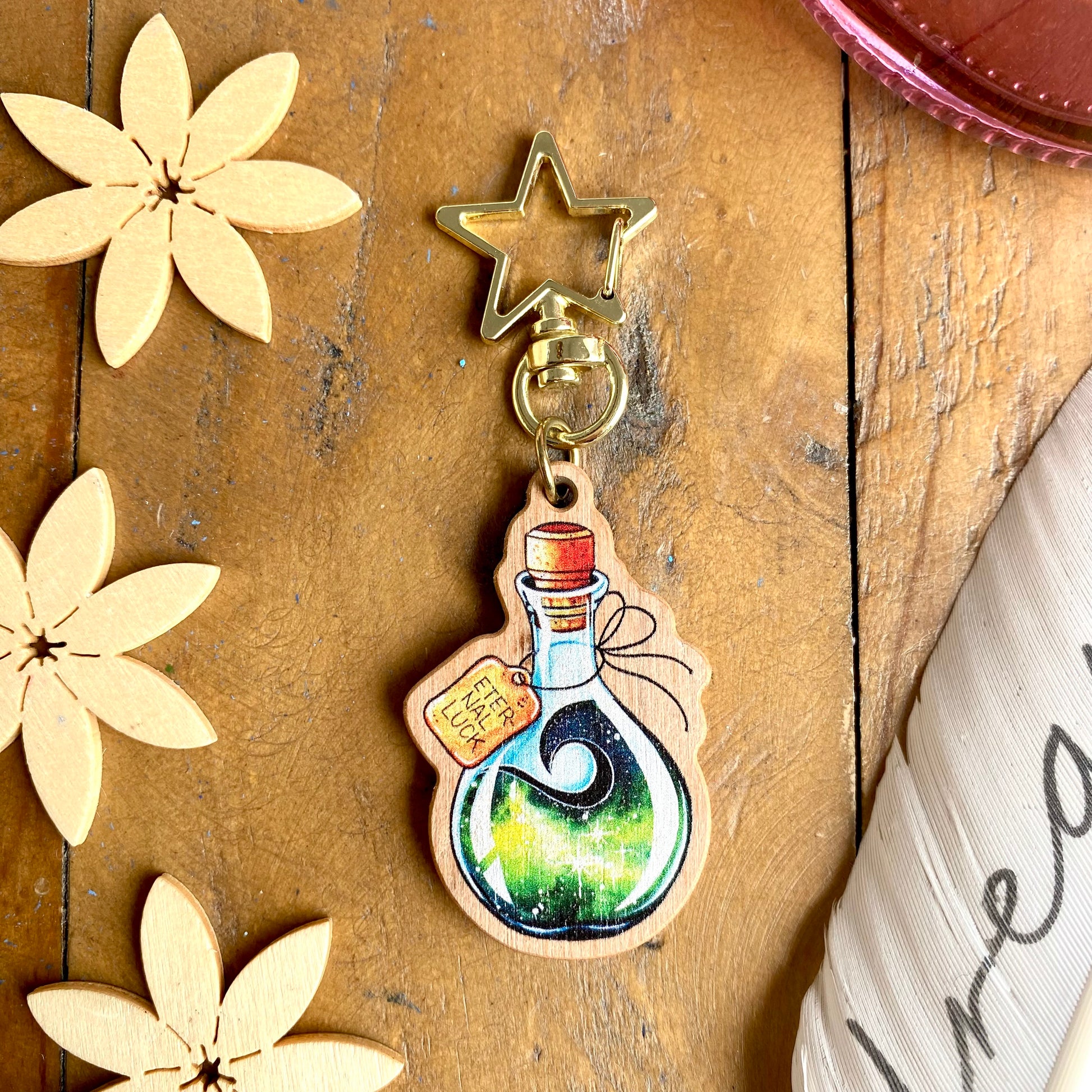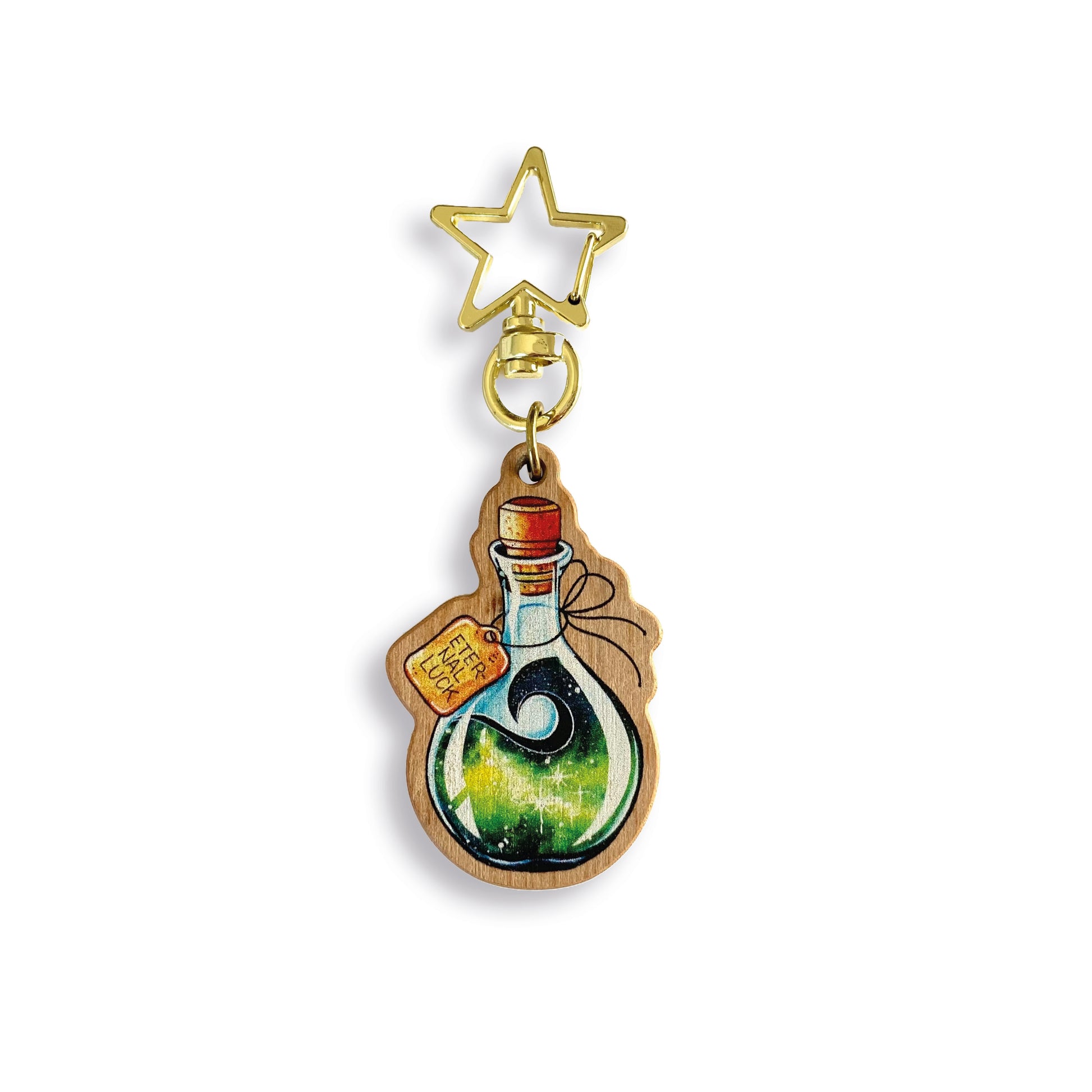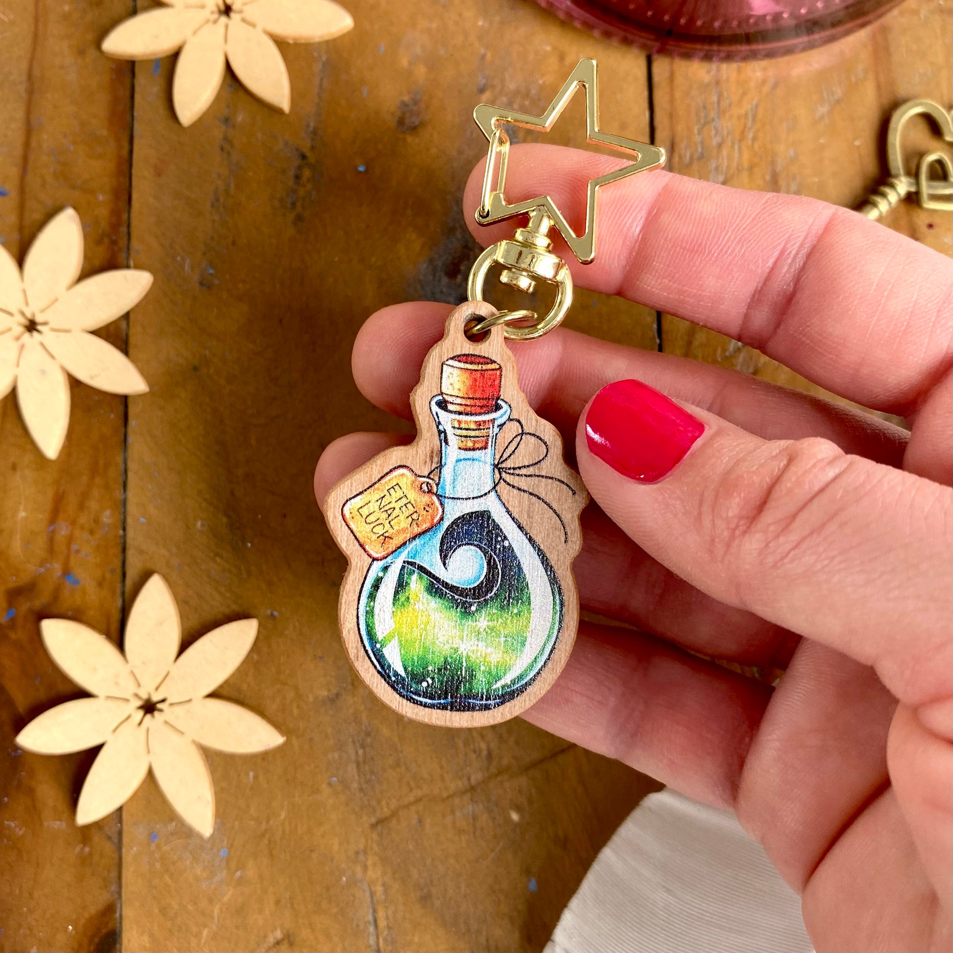 Das Tränkchen wurde in einem hochwertigen Druckverfahren auf Kirschholz gedruckt. Der goldene Verschluss ist sternförmig und lässt sich einfach an einem Schlüsselring oder direkt am Schlüssel befestigen.